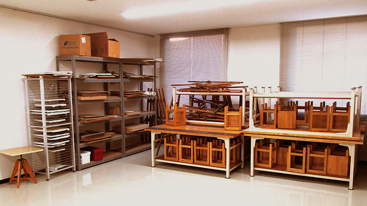 - ホワイトボード、水道、木工作業机7、木工椅子42、机6、椅子18