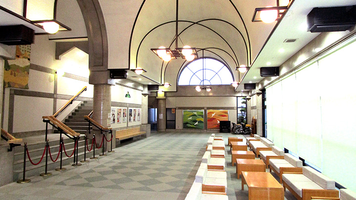 古代ローマ建築を思わせるアーチ状の天井と、松前町の豊かな自然を表現した模様の入ったガラスが特徴的なホワイエです。
