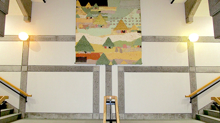 2階へ続く階段には、タペストリー「四季の詩」(森幹雄 原画)がかけられています。肥沃な土地と水に恵まれた松前町の豊かな緑と、実りを象徴的に表現。背景には美しい伊予灘と大空(宇宙)を配する事で、限りない未来への飛翔を詩っています。