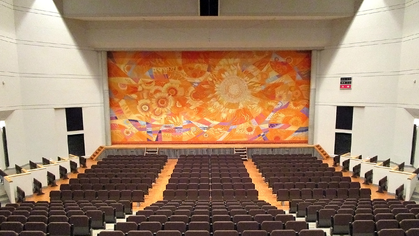 竹市治久原画の緞帳「希望」は、町の花“ひまわり” を太陽にみたてた作品です。豊かな美田とともに、重信川河口に沈む夕日が水面にその輝きを映す様子は、未来の松前町の躍動感を表現しています。