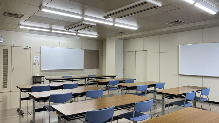 - 電動スクリーン、ホワイトボード、机18、椅子80
